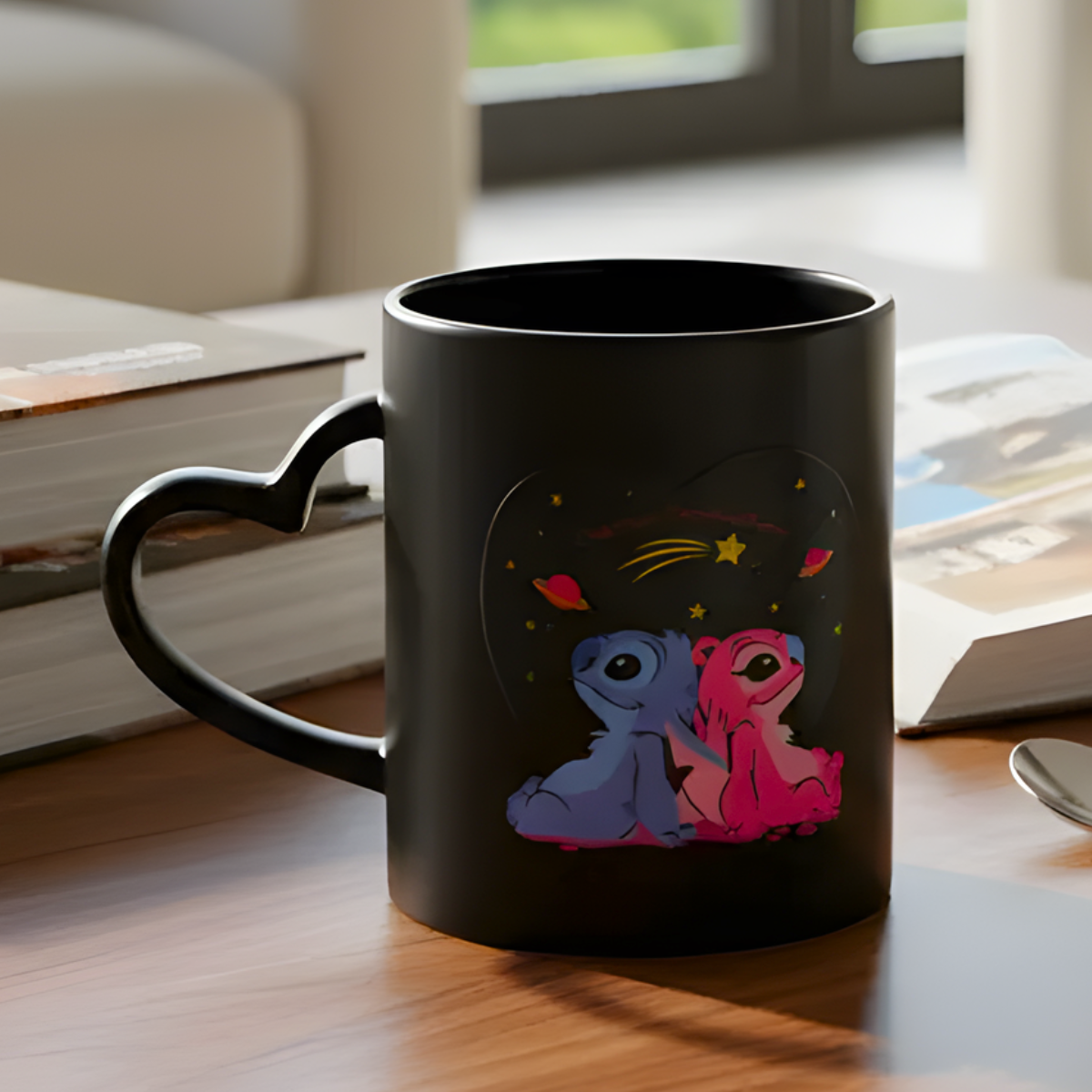 Descubra a fofura de Stitch a cada gole com a Caneca Magic Namorados que muda de cor, revelando segredos a cada bebida quente.