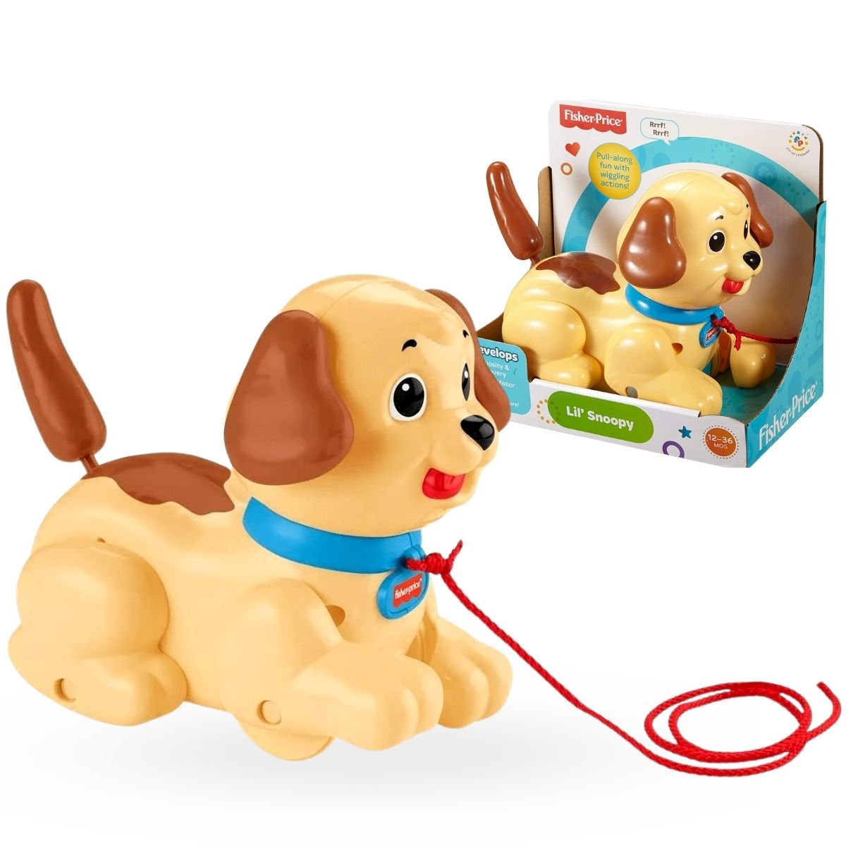 Pegue a coleira desse pequeno animal de brinquedo, puxe o Lil’ Snoopy e veja o que ele faz. Ele vira a cabeça, balança as orelhas, sacode a cauda e dá um "latido" como um cachorro de verdade! Este adorável cachorrinho é um brinquedo estimulante que ajuda a aguçar a curiosidade e a fortalecer a coordenação motora enquanto seu bebê caminha e puxa o brinquedo.